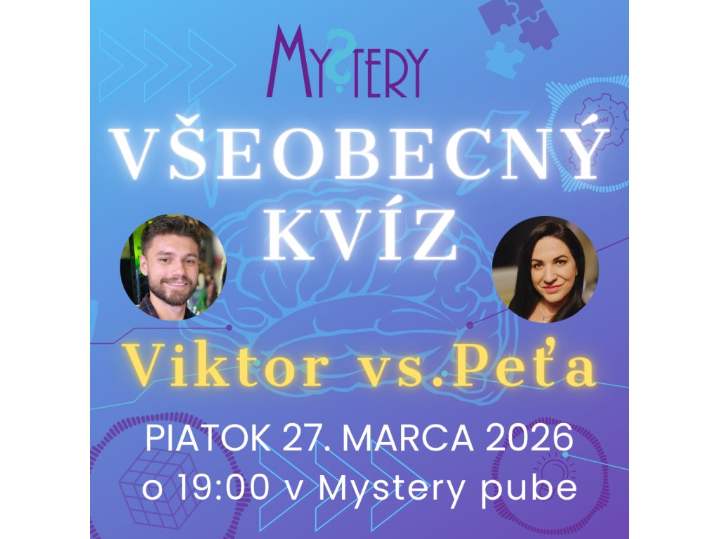 Nemusíte sa však báť. Naše kvízy sú robené úplne jednoducho a vy sa budete búchať do čela, že ste si na také ľahké veci nespomenuli. Alebo nie? Budete vedieť všetko a ašpirovať na víťazov? Poďte si otestovať svoje vedomosti do Mystery pubu a vyhrajte parádne ceny!